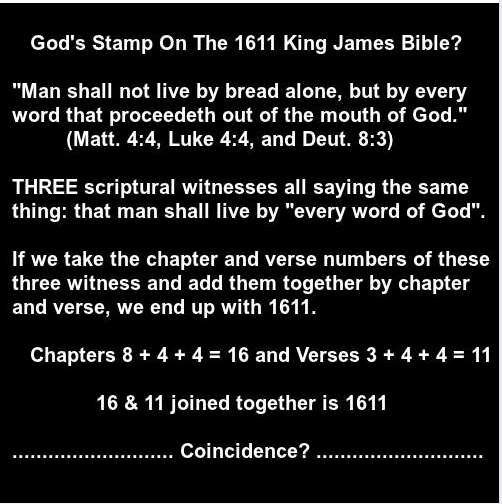 If we take the chapter and verse numbers of these three witness and add them together by chapter and verse, we end up with 1611. Chapters 8 + 4 + 4 = 16 and Verses 3 + 4 + 4 = 11, thus 1611.